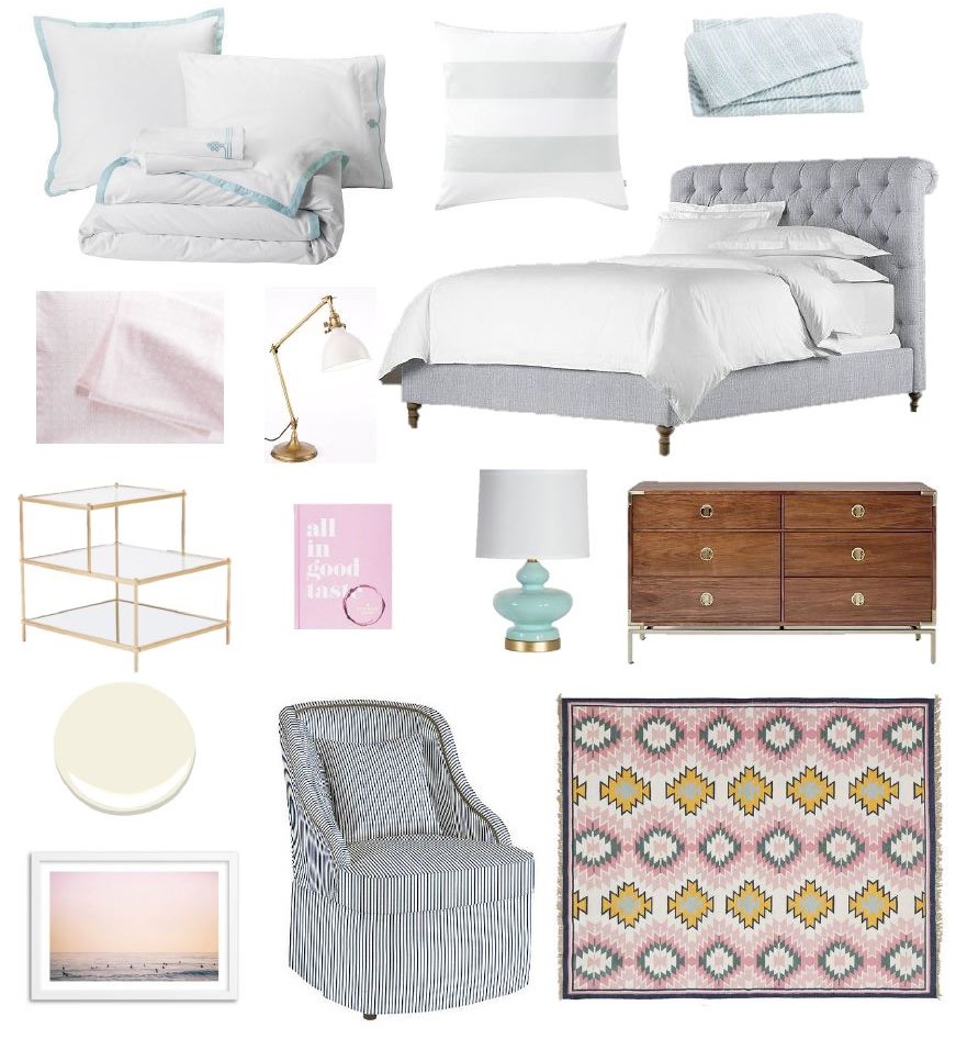 Trellis Pillowcases {Shell} || Brahms Mount Multistripe Blanket {Surf} || Chesterfield Sleigh Bed {Belgian Linen - Mist} || Border Frame Duvet Cover {Aqua} || Gobi Embroidered Sheet Set {Aqua} || Terrace Side Table {Antique Brass} || Genie Accent Lamp || Campaign Dresser || Aged Brass Task Lamp || Benjamin Moore Ivory Paint || Kate Spade All in Good Taste || Swivel Club Chair {Ticking Stripe} || Painted Desert Rug || Max Wanger County Line